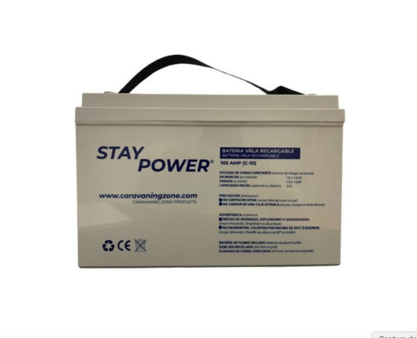 Batería de 105 amperios y 12 voltios, de la marca Stay Power, perfecta para instalaciones de segunda batería en vehículos.