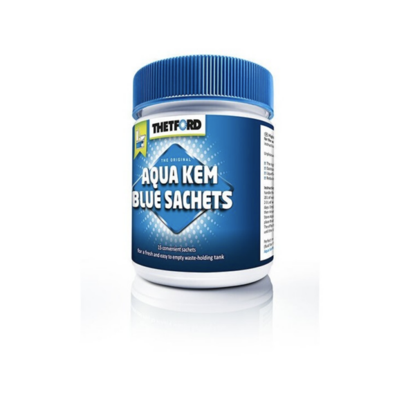 Bote con 15 bolsitas para WC químico de furgonetas camper y autocaravanas, del fabricante Thetford, modelo Aqua Kem Blue Sachets.